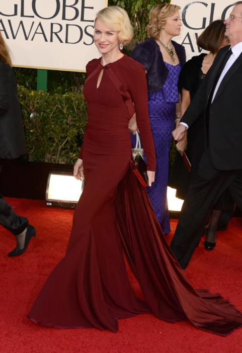 Naomi Watts preciosa con un Zac Posen en color vino, la cola del vestido espectacular.